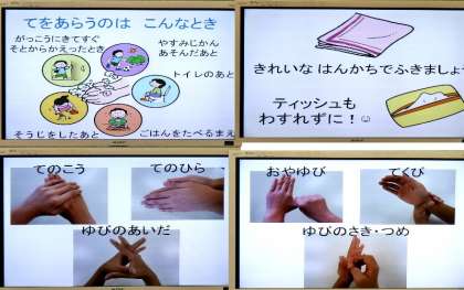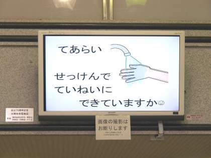 玄関のひがみやビジョンに、「手洗いをていねいにしよう」と画像で呼びかけています。毎日の感染者数が増加しています。ていねいな手洗い、マスク着用、換気をしっかりとしていきましょう。
