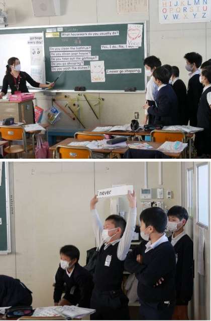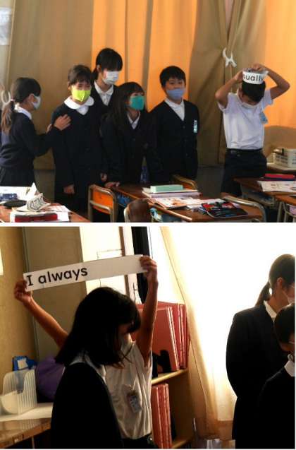 5年生の英語では、決してない、いつも、時々、ふつうは、の単語を使えるように、グループて分かれて練習しています。