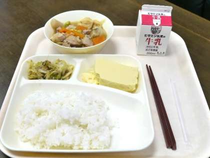 今日ま献立は、たまごどうふ、鶏肉と一口がんもの煮物、野菜のそぼろいため、ごはん、牛乳でした。