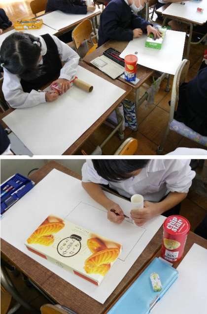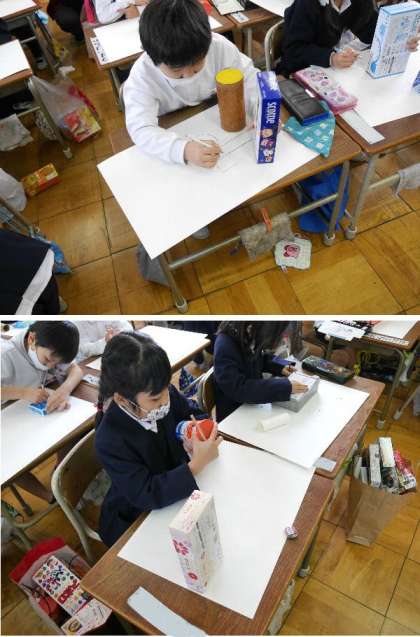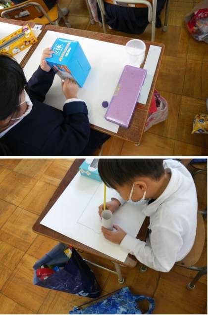 1年生が、持ってきた四角や円筒などいろいろな箱をつかって、画用紙に型ぞって絵を描いています。どんな絵ができるかな。
