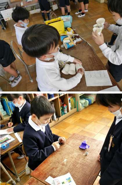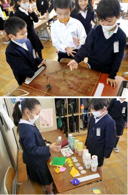 1年生が、どんぐりや松ぼっくりを使った、コマやおもちゃを作りました。みんなに紹介して遊んでいます。上手にできた人には、メダルがかけられます。