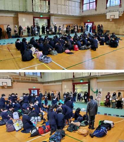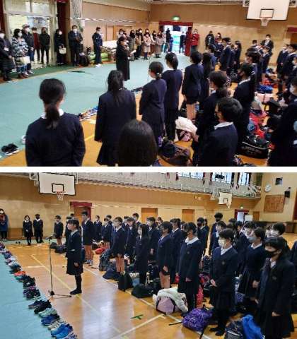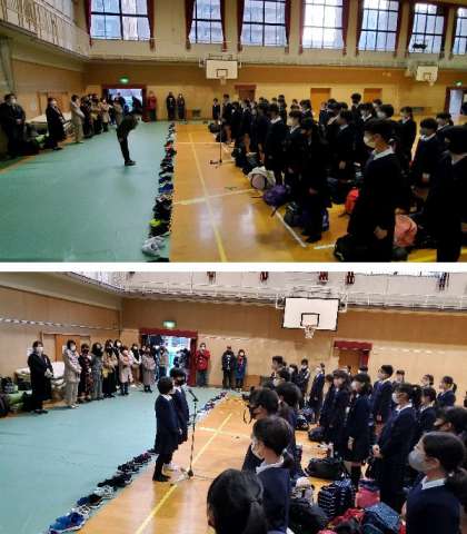 講堂で出発式を行いました。たくさんの保護者の方々のお見送りありがとうございます。安全に気をつけて楽しく思い出に残る修学旅行にします。