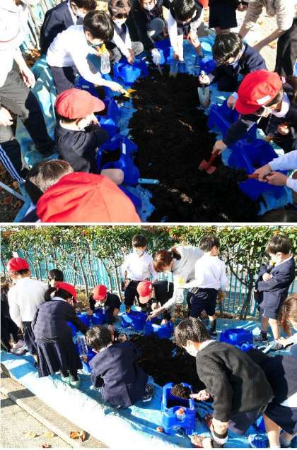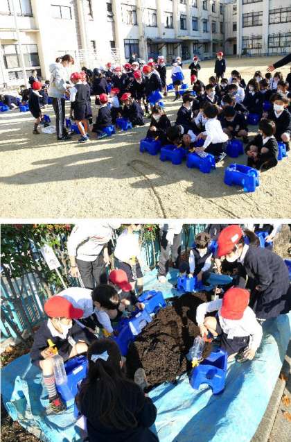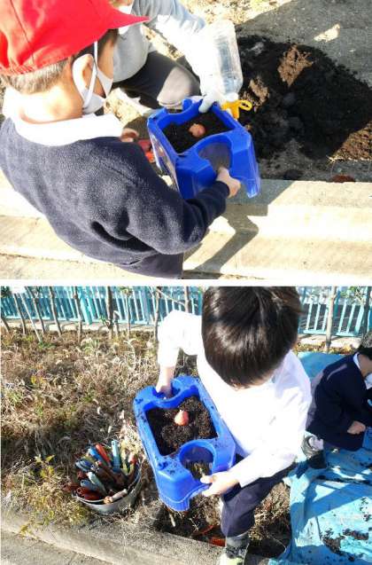 1年生は、アサガオの鉢を再利用して、チューリップの球根を植えました。