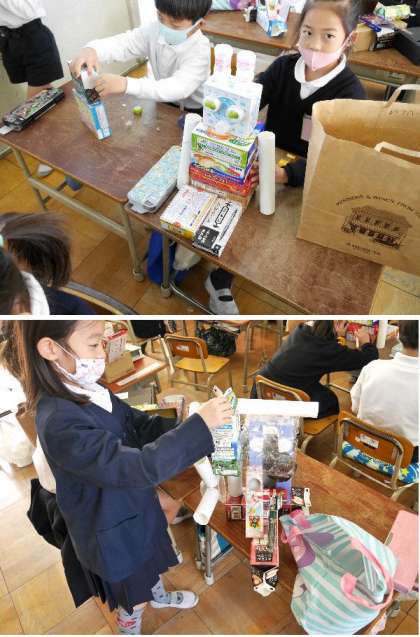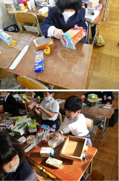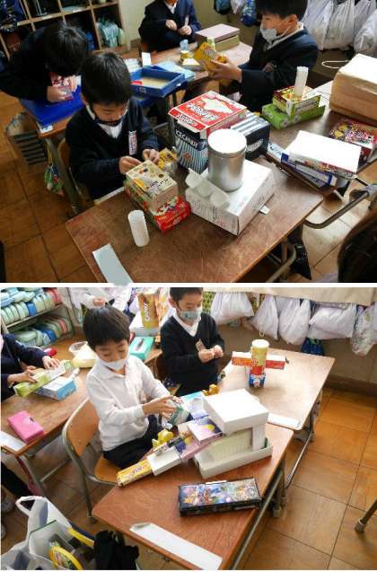 1年生では、おうちからいろいろな空き箱をもってきてもらって、いろいろな学習に利用しています。今日は、箱をはりあわせていろいろなものを作りました。