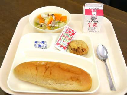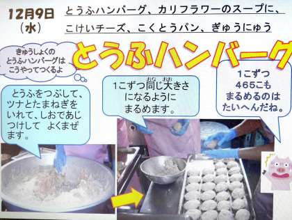 今日の献立は、とうふハンバーグ、カリフラワーのスープ煮、固形チーズ、黒糖パン、牛乳でした。たくさんのハンバーグをひとつひとつ手で作っていただき、ありがとうございました。