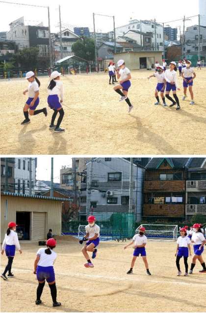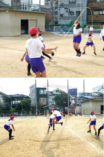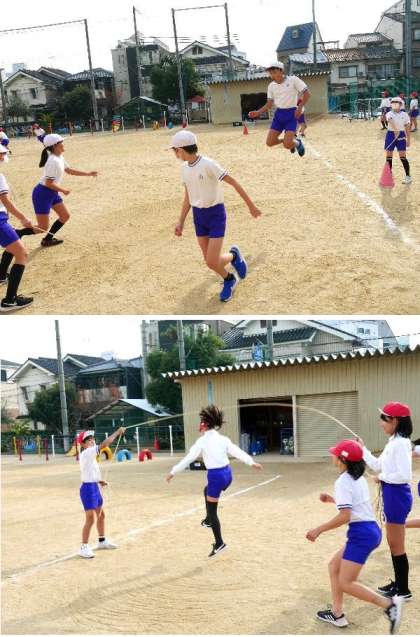 6年生が体育で、ながなわとびで、みんなでとんでいます。リズムよくたのしそうです。