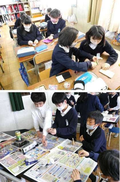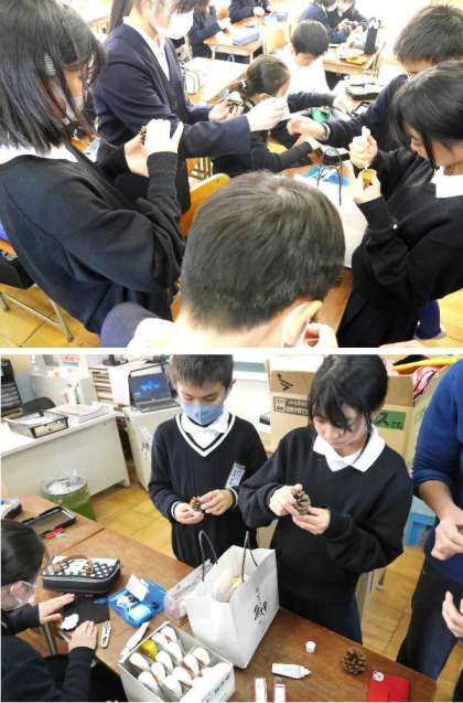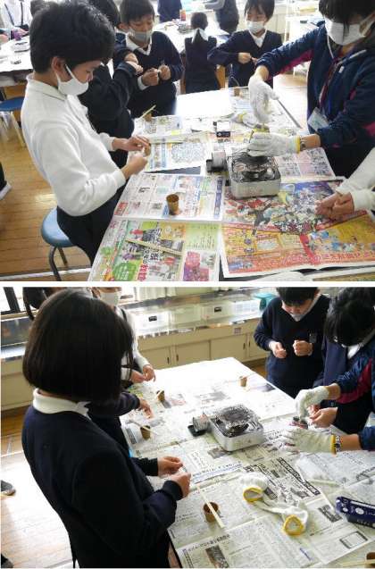 4年〜6年のクラブ活動です。手芸部と科学部です。手芸部はクリスマスにちなんで、まつぼっくりでツリーなどを作っていました。科学部もクリスマス前ということで、飾りキャンドルを作っています。ロウソクをとかして、太く型ぞった枠に流し込み、好きな色をつけていました。
