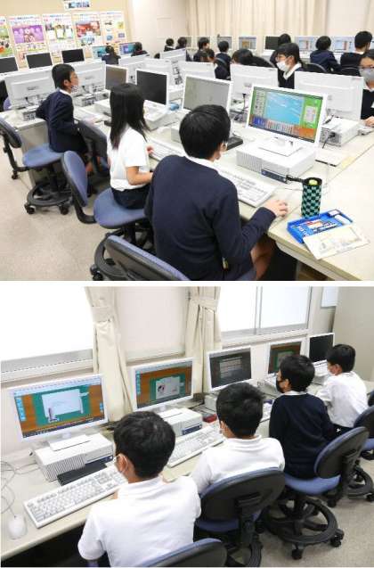 4年〜6年のクラブ活動です。パソコン部と卓球部です。パソコン室と体育館での活動です。