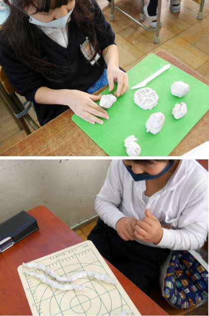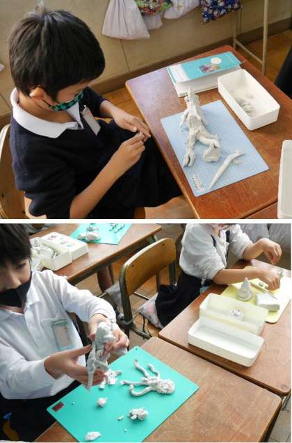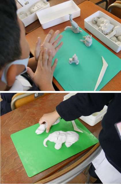 2年生が粘土で造形しています。動物の親子を作っています。ぞう、へび、いろんな動物がいます。