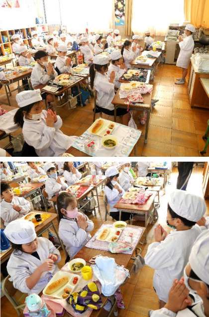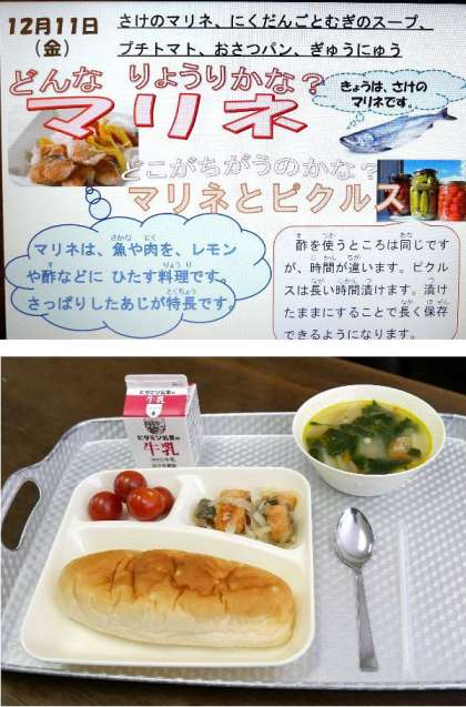 今日の献立は、さけのマリネ、肉団子と麦のスープ、プチトマト、おさつパン、牛乳でした。おいしくいただきました。