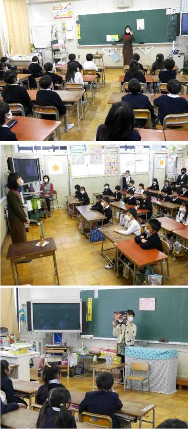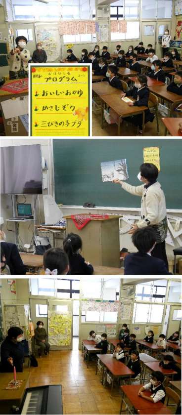 今日は、1年生と2年生で、都島おはなしサークルから来ていただき、絵本を読んでいただきました。本来なら、ロウソクをともして、導入から、おはなしの世界の雰囲気づくりをしますが、今年はコロナ感染予防のためおこないませんでした。子どもたちは、つぎつぎと出てくるお話しの世界に、いろいろな質問がとびだしていました。