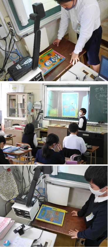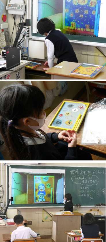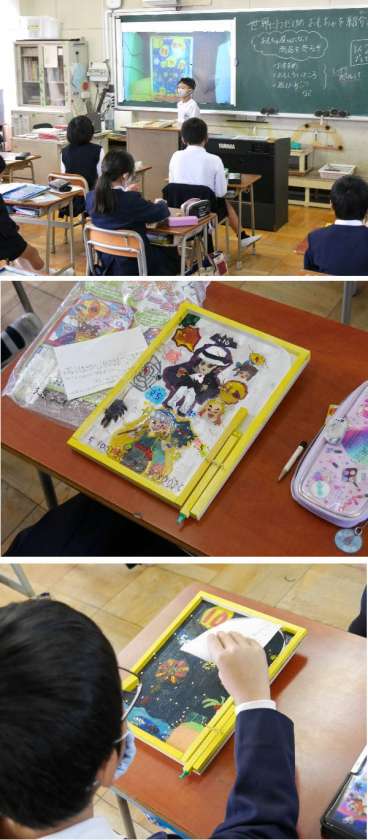 4年生が、図工でつくった玉転がしゲームの発表会をしていました。作品を見せて、おすすめやおもしろいところなどを説明していました。そして、ゲームをしたい人がためしていました。玉の動きが釘によっていろいろあるので、デザインとマッチしてとても楽しいゲームになっていました。