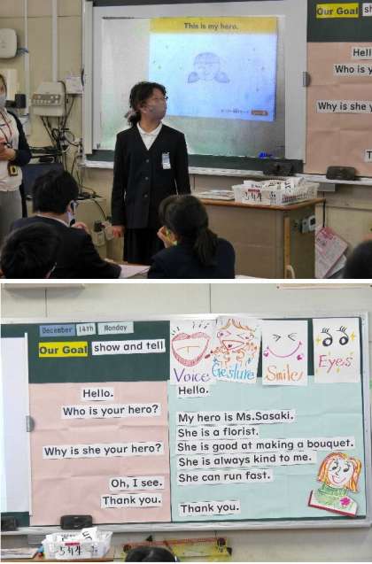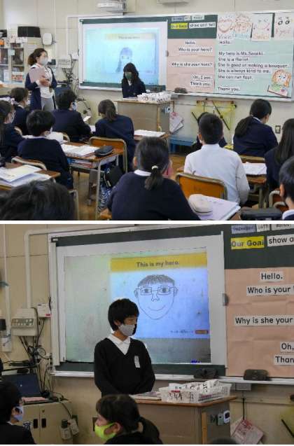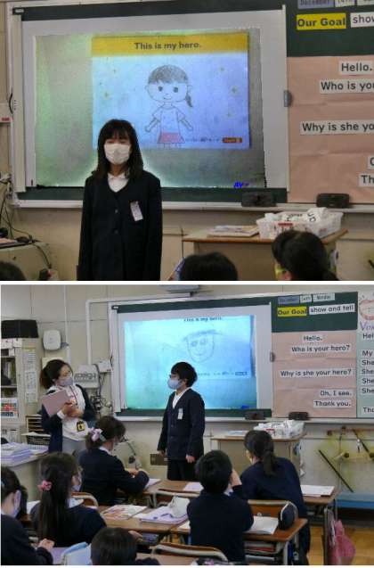 5年生では、英語の「わたしののヒーロー」を紹介しています。ヒーローカードには似顔絵が描かれてあります。それをみながら、英語で説明をしています。お父さんやお母さんがヒーローて登場です。