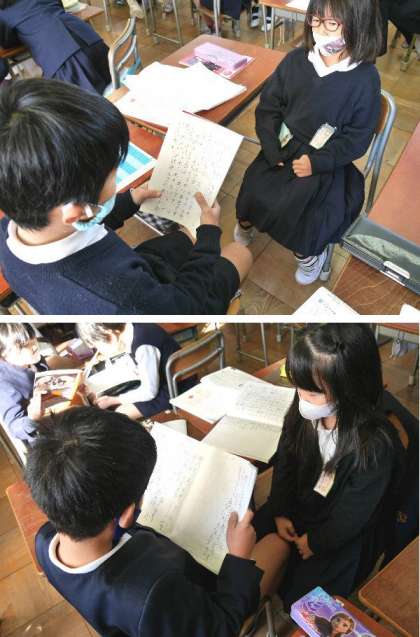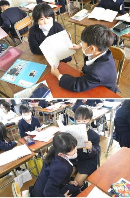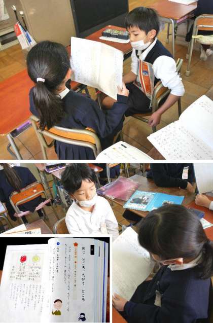 2年生の国語では、「同じところ、ちがうところ」について学習しています。2つのものをくらべたことを、ペアで説明しあっています。相手に伝わるように説明をする練習です。聞くほうもしっかりと耳をむけて聞いています。