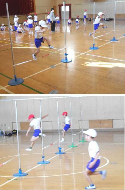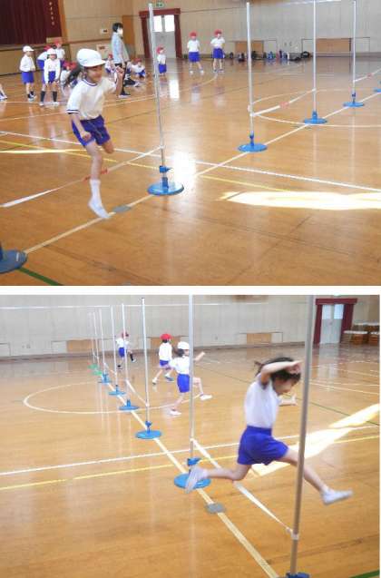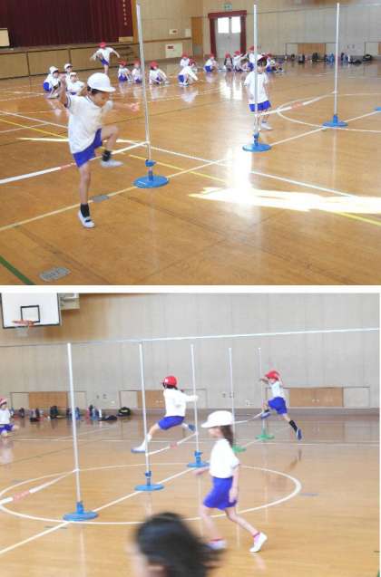 1年生が体育館で、ゴムをとびこえて往復しています。上手にとびこえられるかな。