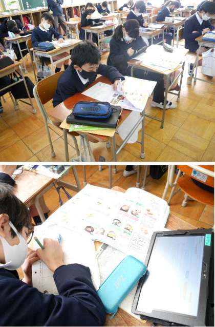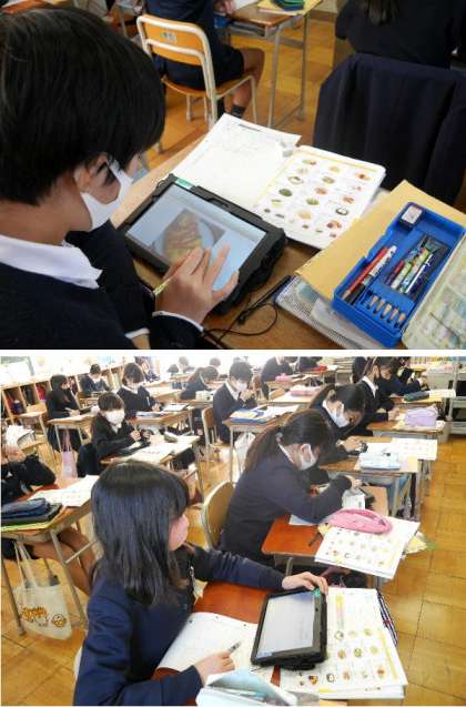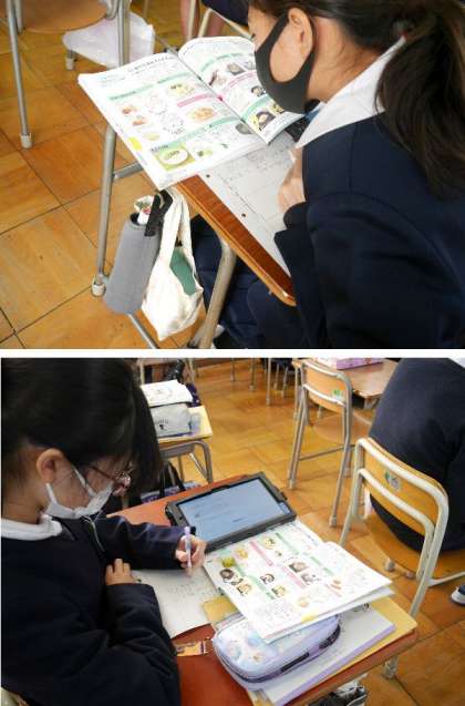 6年生の家庭科で、タブレットを使って、いろいろなおかずについて調べていました。タブレットを使いこなしていますね。