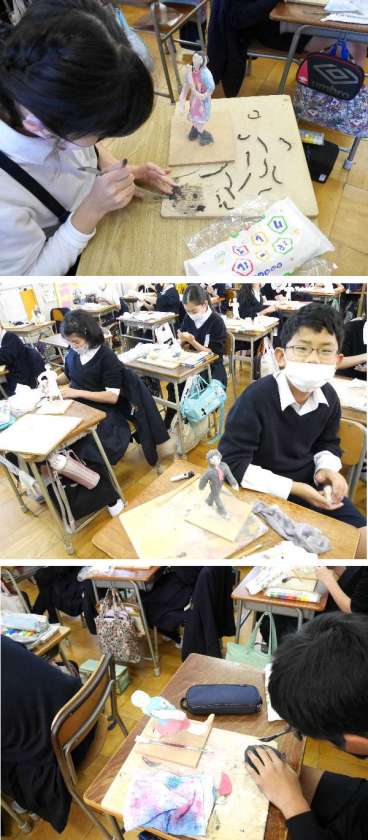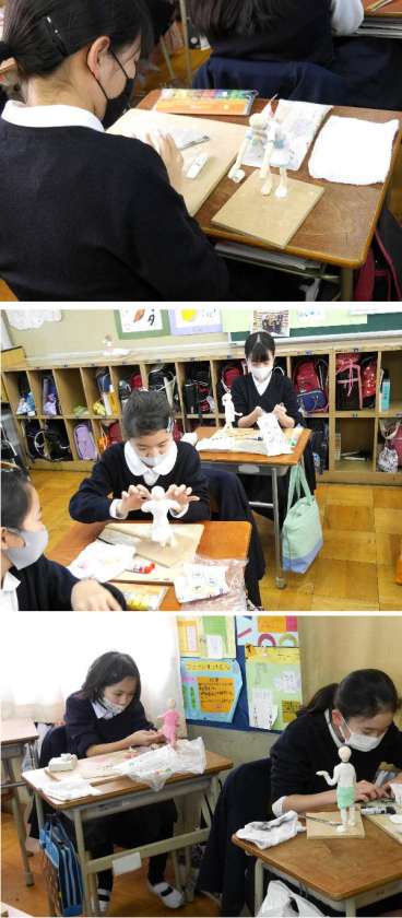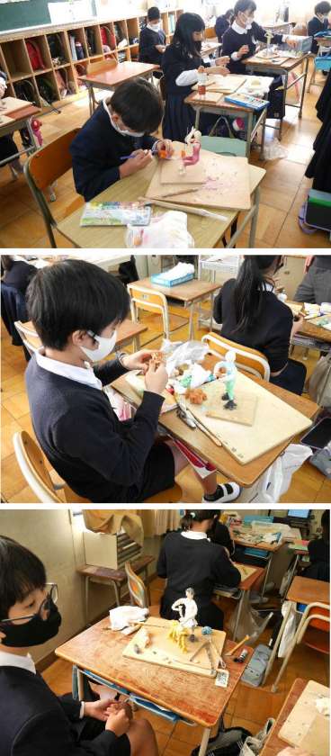 6年生が未来の自分の姿を粘土模型で作っています。細かい作業に集中しています。早く作業しないと硬くなってしまうんです。
