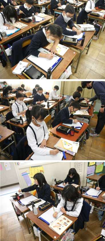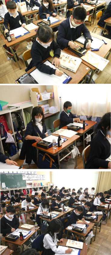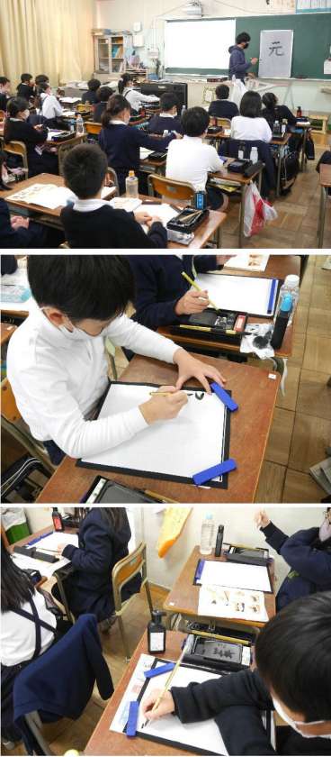 3年生の習字では、小筆を使って自分の名前を書く練習をしていました。小さい字はむずかしいですね。