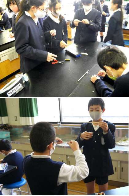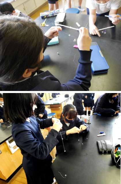 長さのちがうふりこを作って調べています。