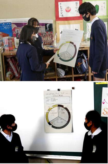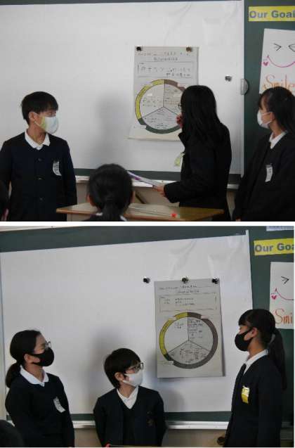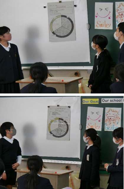 6年生では、食事の栄養バランスのとれたメニューを考えて、英語で発表していました。スマイル、ジェスチャー、クリアボイス、アンコンタクトで発表できましたか。