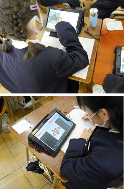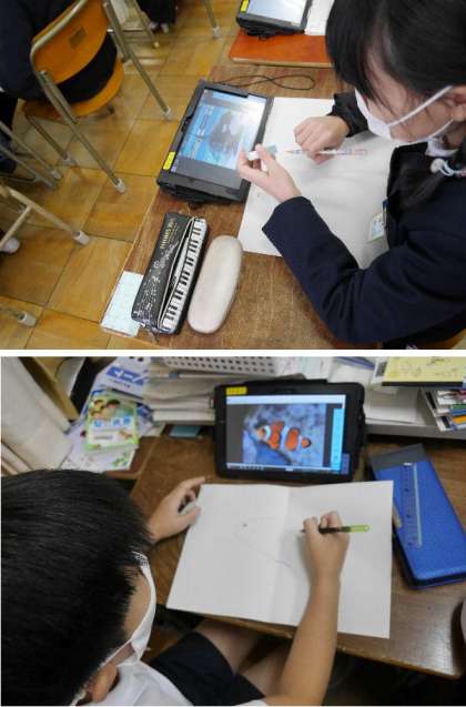 5年生がタブレットで海の生き物を調べて絵を描いています。