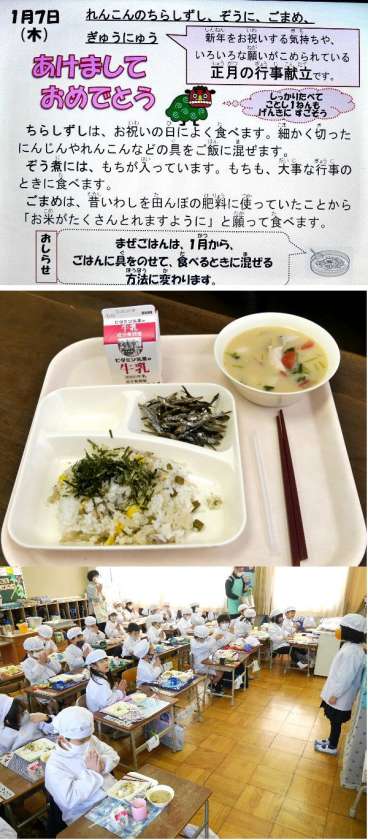 今日から、3学期の期夕食がスタートです。今日の献立は、れんこんのちらしずし、雑煮、ごまめ、牛乳でした。お正月の行事献立ですね。日本の伝統的なメニューをいただきました。