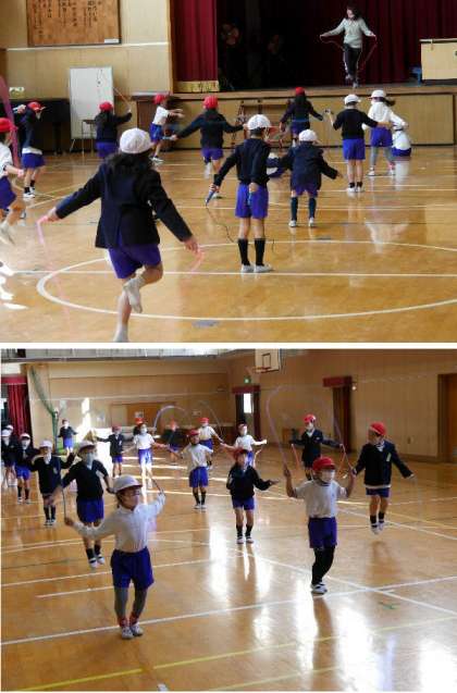 1年生が体育館でなわとび運動をしています。2月になるとなわとび週間もあります。