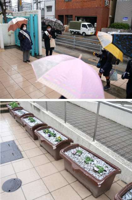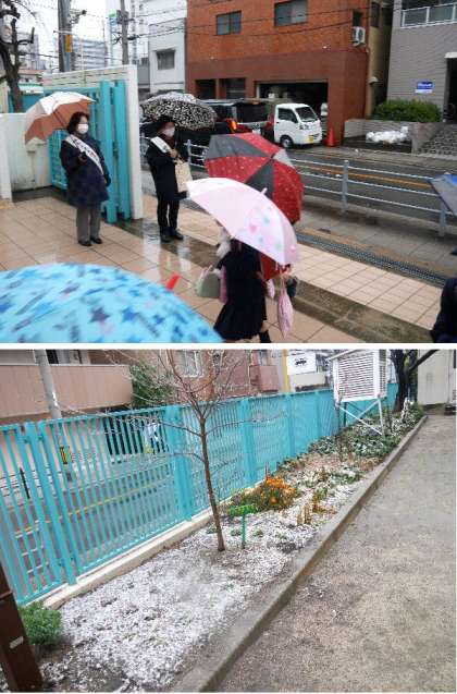 毎月、地域の更生保護女性会の方が、玄関で登校時にあいさつをしてくれています。今日は朝から雪のふるなかの寒いところありがとうございます。