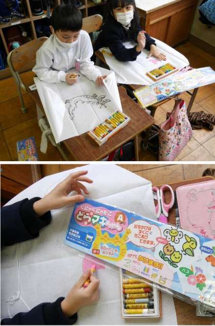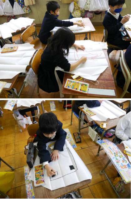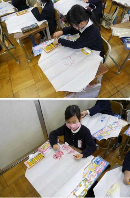 1年生が凧に絵を描いています。絵を描いたら完成です。じょうずにあがるといいですね。