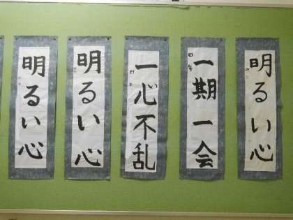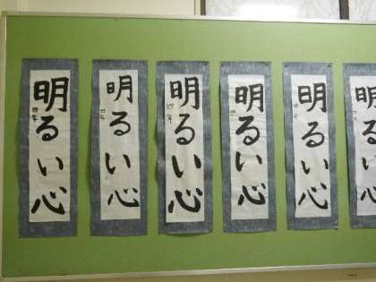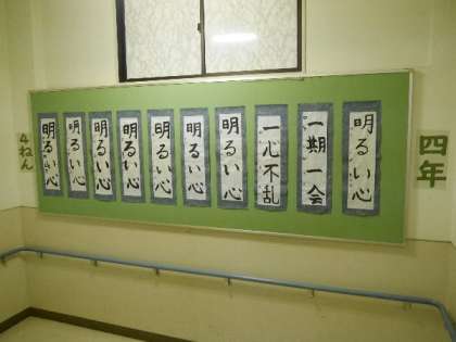 4年生の掲示板に、書き初めが掲示されました。「明るい心」「一心不乱」「一期一会」。