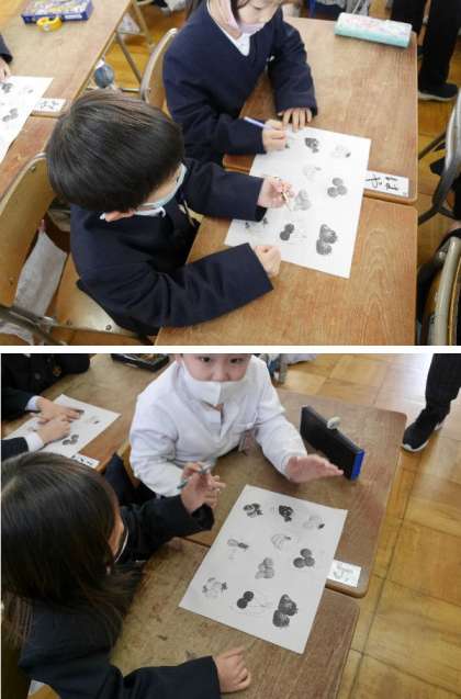 1年生では、クリス先生が英語を教えにきてくれました。黒板にはいろいろなくだものの絵があります。英語で「What do you want?」と聞かれ、英語でほしいものをクリス先生が言うと、プリントの絵にチェックします。