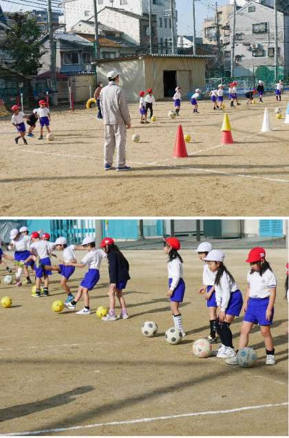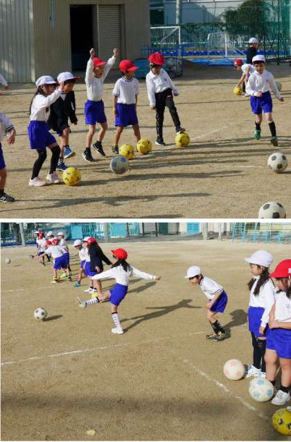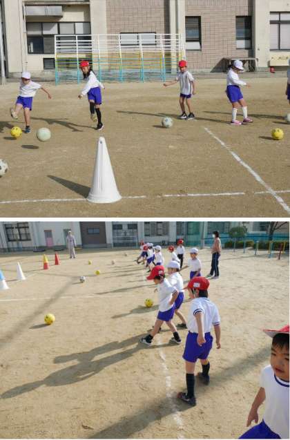 1年生が運動場でボールをける練習をしています。運動場は陽があたって少し暖かいです。