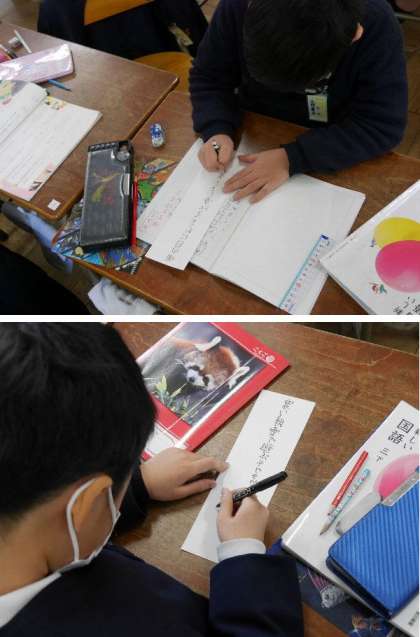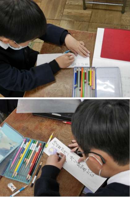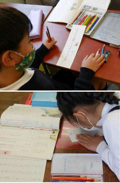 3年生が5・7・5と俳句を作っています。なかなかむずかしいと、悩んでいる児童もいます。