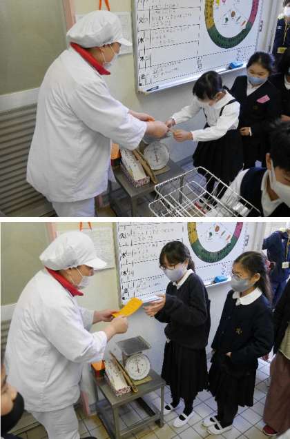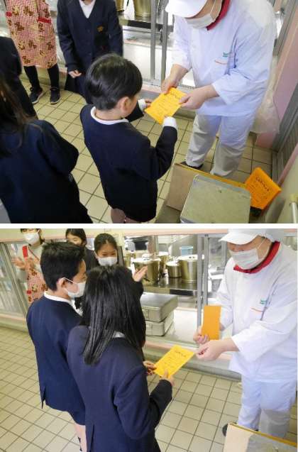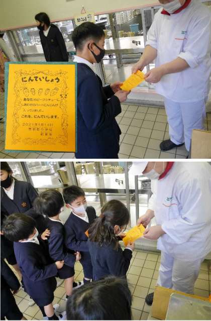今日の給食のシチューにしあわせのハートニンジンが入っていた人には、給食調理員さんから認定証が手渡されました。しあわせな気持ちになりうれしいですね。