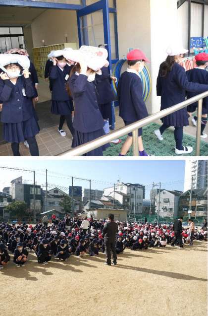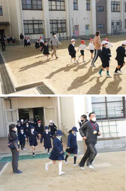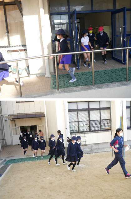 避難訓練です。地震がおさまったので、放送の指示でいったん運動場に集合して、人員点呼をして安全を確認します。みんな小走りで集まってきます。