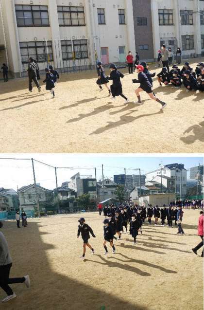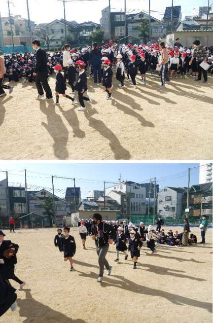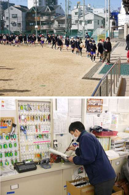 避難訓練です。運動場での人員点呼で確認したあと、津波警報がでたので、3階以上の教室へ避難します。