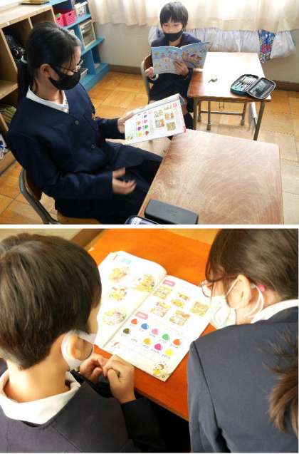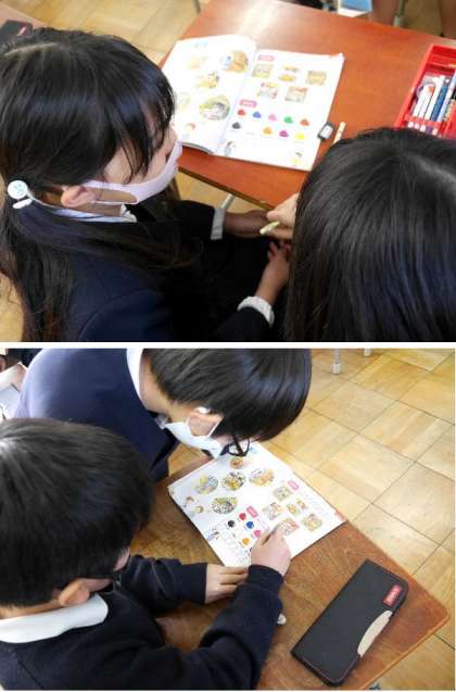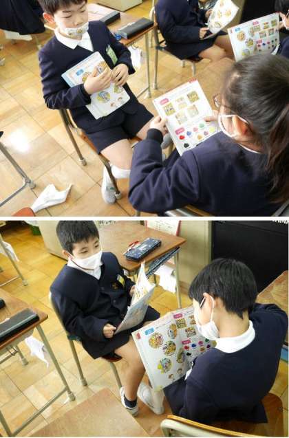4年生の英語です。「What my favorite color?」と聞かれて、好きな色をあてます。ペアでお互いに聞きあって学習です。