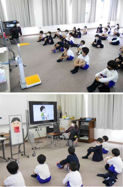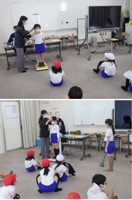 発育測定を各学級ごとに、多目的室で順におこなっています。1年生では、発育測定の前に、保健室の先生からお話しがありました。