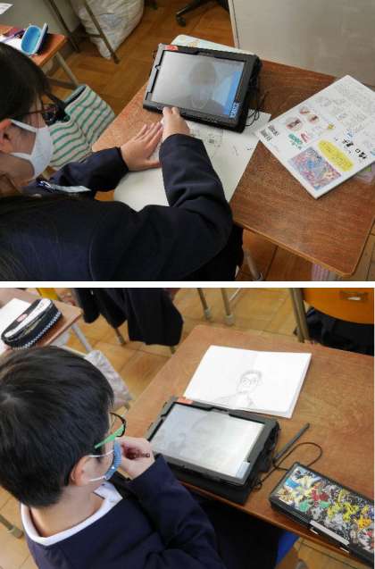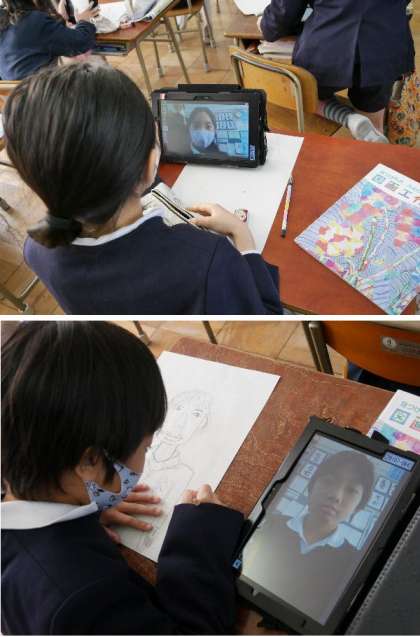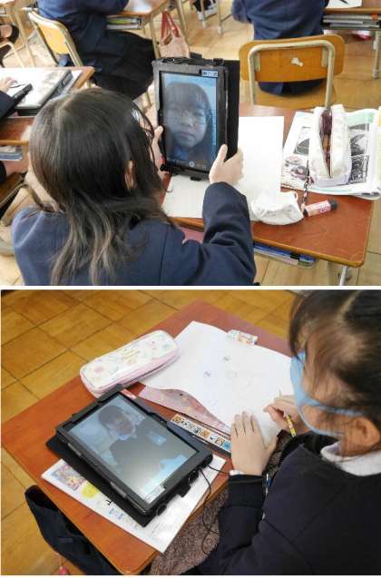 4年生では、タブレットで写真をとって、自画像を描いていました。鏡ではなくて、タブレットを使うのは最新ですね。