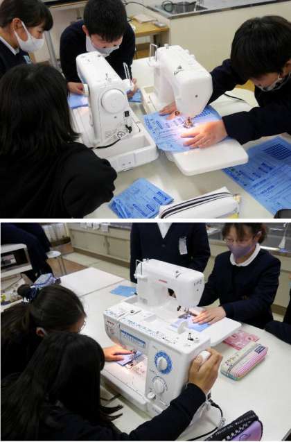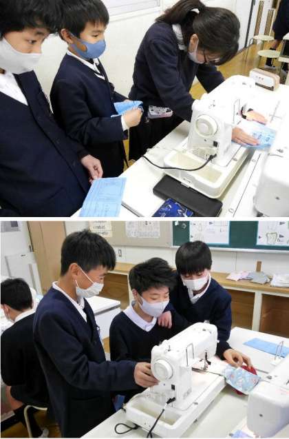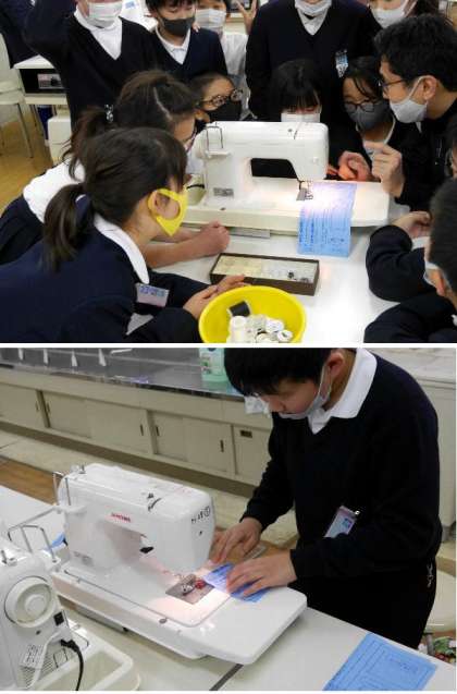 5年生が、家庭科室でミシンを使っています。練習用の生地の線にあわせて縫う練習です。すごく早くうまくやってるなと思ってよくみると、まだミシンに糸がついていませんでした。練習です。