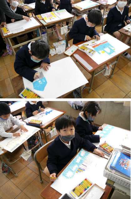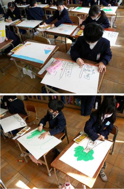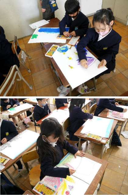 1年生が絵を描いています。「できたらいいなこんなこと」で行きたい場所を描いています。