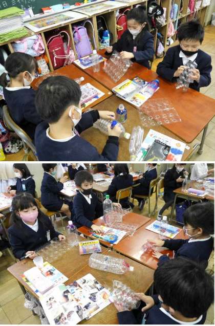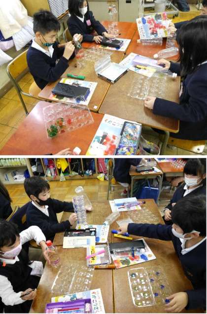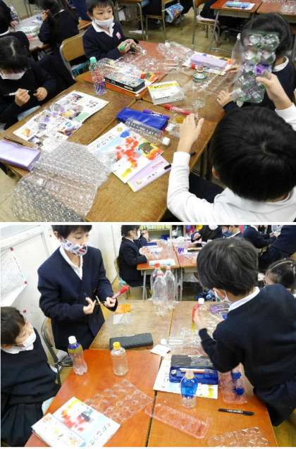 2年生が、ペットボトルにマジックで色をぬっています。透明の容器に色をぬり、ひかりをとおしてみてみるとどんなふうに見えるかな。
