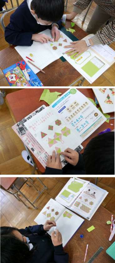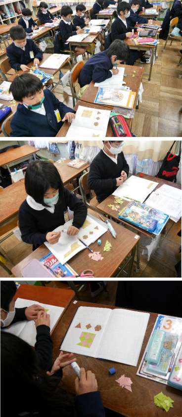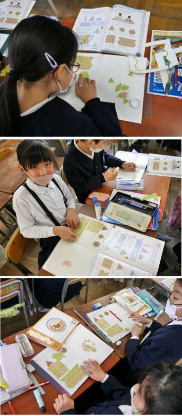 3年生の算数では三角形について学習しています。教科書についている三角形を切り抜いて、ノートにひきつめて張り付けています。いろいろな形を作ることができますね。