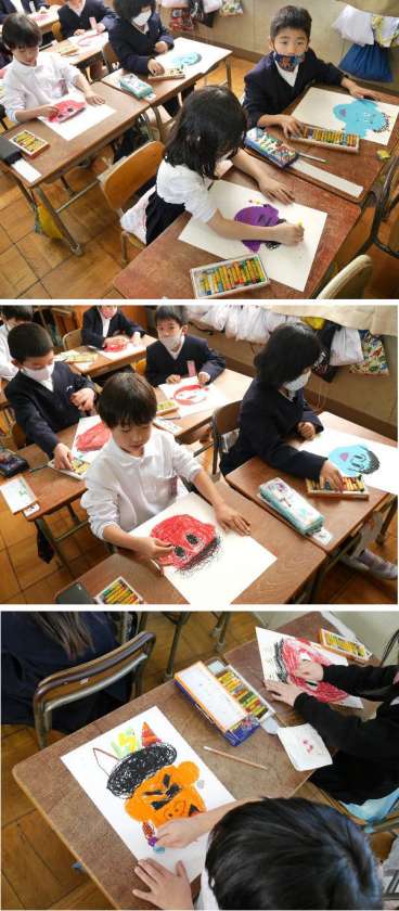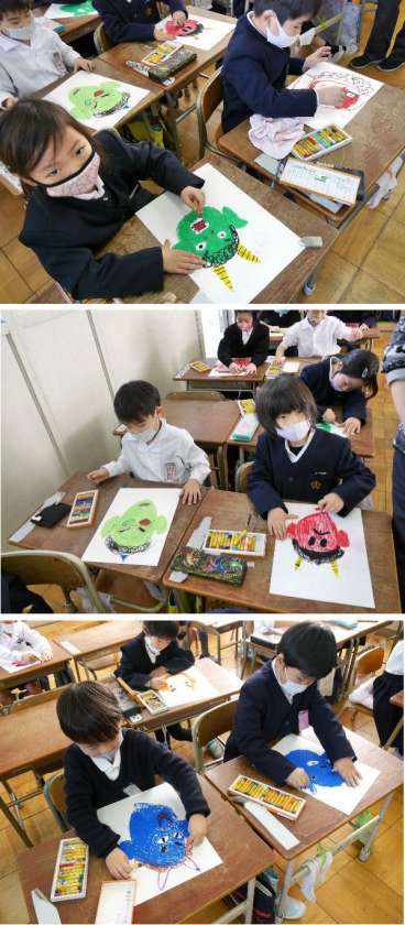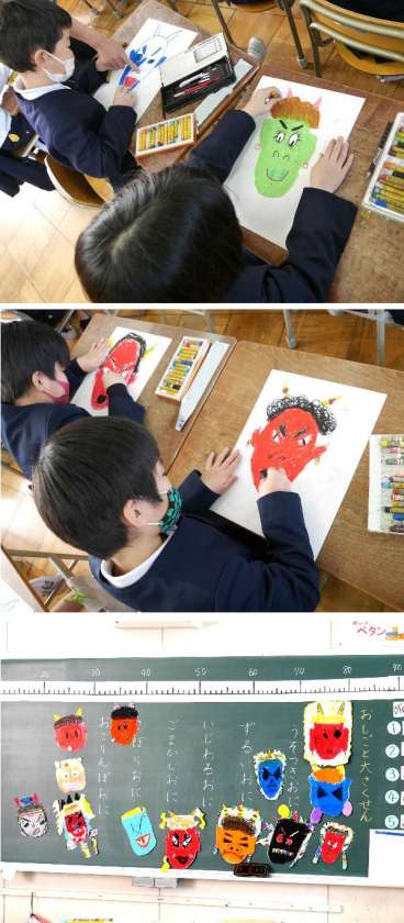1年生がいろいろな色の鬼を描いています。おこりんぼおに、さぼりおに、いじわるおになど、いろいろな鬼なんですね。