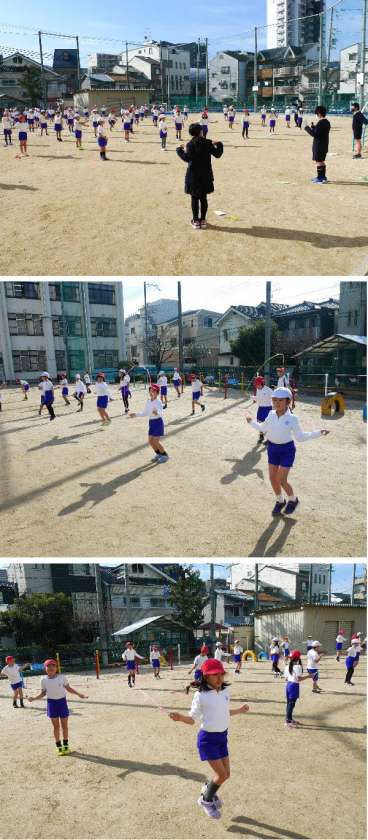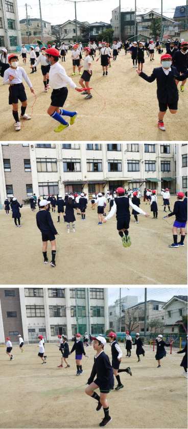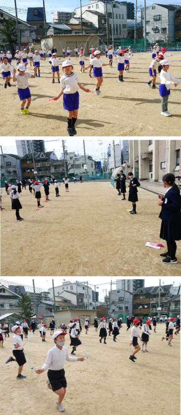 今週はなわとび週間ということで、20分休みと昼休みに、2年生と5年生が運登場でなわとびをしました。今日は少しあたたかいですね。体育委員が説明して音楽をかけてくれています。