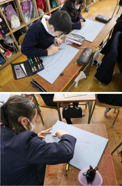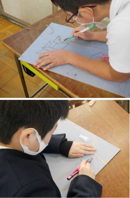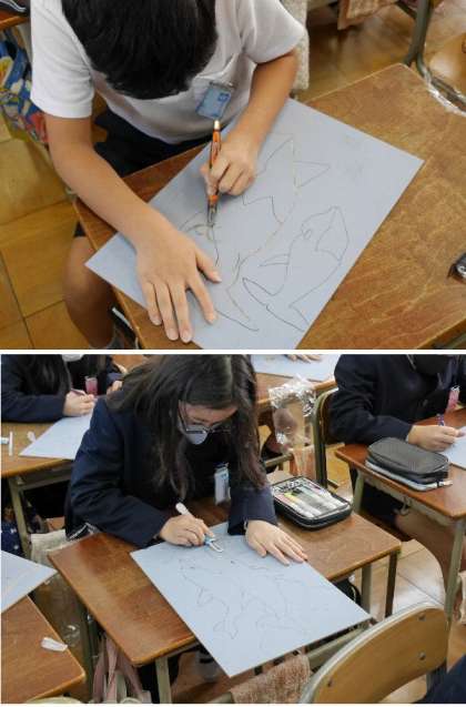 5年生では、海の生き物の下絵を描いてきました。今日は下絵を板に写し取って、版画にするために彫刻刀でほっています。気をつけて作業してくださいね。