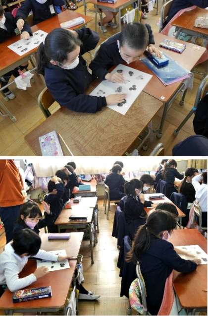 2年生にネイティブのクリス先生が来てくれました。「What do you want?」と聞かれて、クリス先生がほしい果物を英語で言います。それをよく聞き取って、机の上の果物の絵を指さします。ペアでどっちが早く聞き取れるかな。
