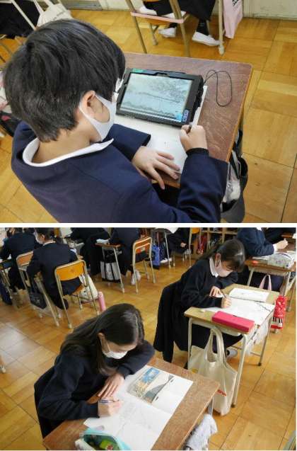 6年生が浮世絵などの有名な絵を見て模写をしています。バランスよく描くために、絵に格子の線をひいたりしています。