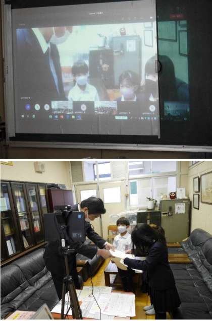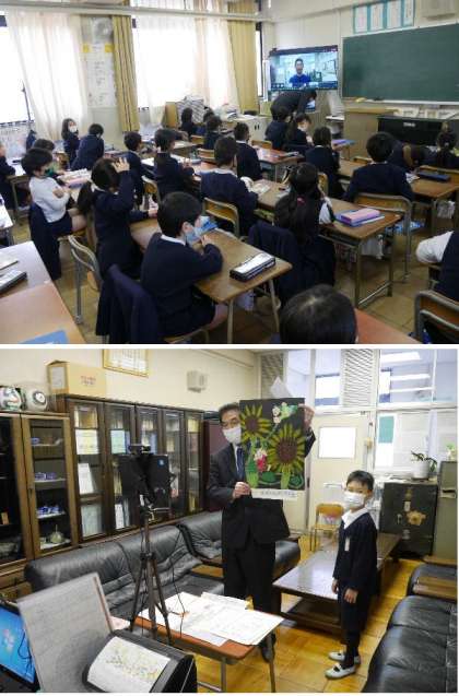 オンラインでの全校朝会です。図画作品出品の表彰や、1年生が500冊読破した表彰を行いました。また、来週から、児童会で行われるユニセフの募金活動についてお話しました。
