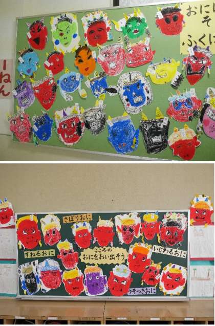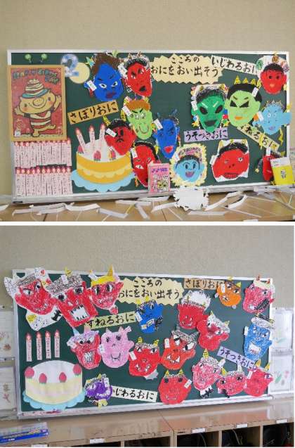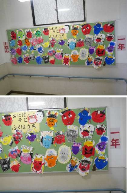 明日は節分です。1年生の掲示板には、みんなが描いたいろんな鬼がはられています。「福はうち!」今年はよい年になりますように。
